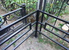 Последовательность работы стандартная. Во-первых, сжечь старую краску, во-вторых, зачистить ограду до металла, после покрыть грунтом чистый металл и покрасить черной краской. После покраски убраться на могиле. Далее на фото обожженная краска на ограде.